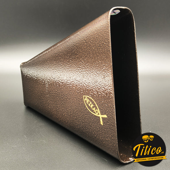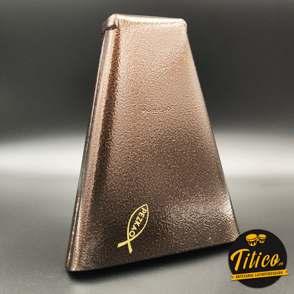 Campana Tone Pezkao Titanic, de tonalidad baja, con exclusivo acabado en bronce martillado. Fabricada a mano por el percusionista y luthier de cencerros James “Pezkao” en Cali, Colombia.