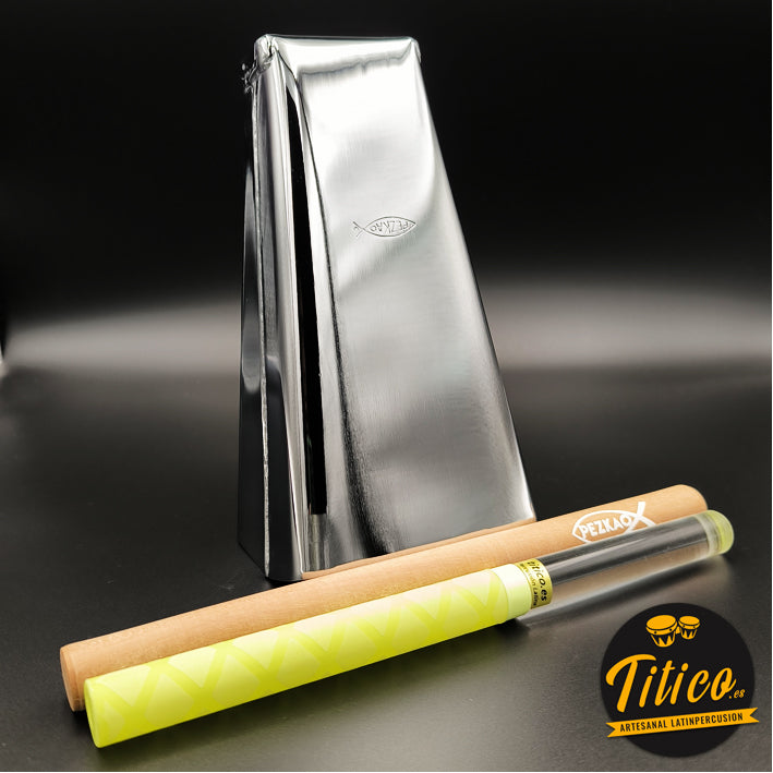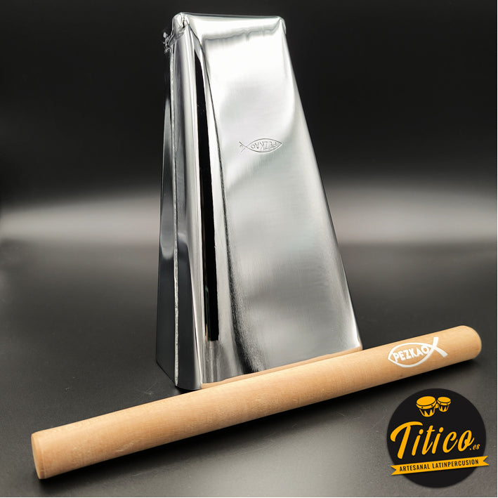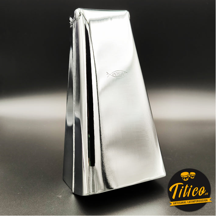 Campana Tone Pezkao J1, de tonalidad súper alta, con elegante acabado en cromo. Fabricada a mano por el percusionista y luthier de cencerros James “Pezkao” en Cali, Colombia.